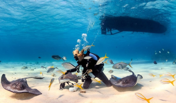 Grand Cayman, conocida como la mayor de las tres islas, ofrece una variedad de sitios de buceo, incluida la famosa Stingray City, donde los buzos