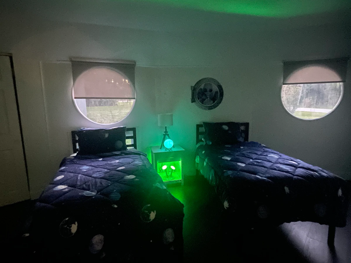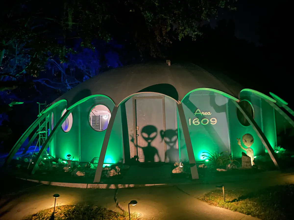 Esta casa cúpula con forma de Objeto Volador No Identificado (O.V.N.I) ha aterrizado desde una galaxia lejana en el pintoresco lago Placid en Florida, Estados Unidos. Es un alojamiento ideal para festejar Halloween, relajarse junto al pozo de fuego y jugar en el loft Galaxy Arcade a Star Wars, Space Invaders y Terminator.