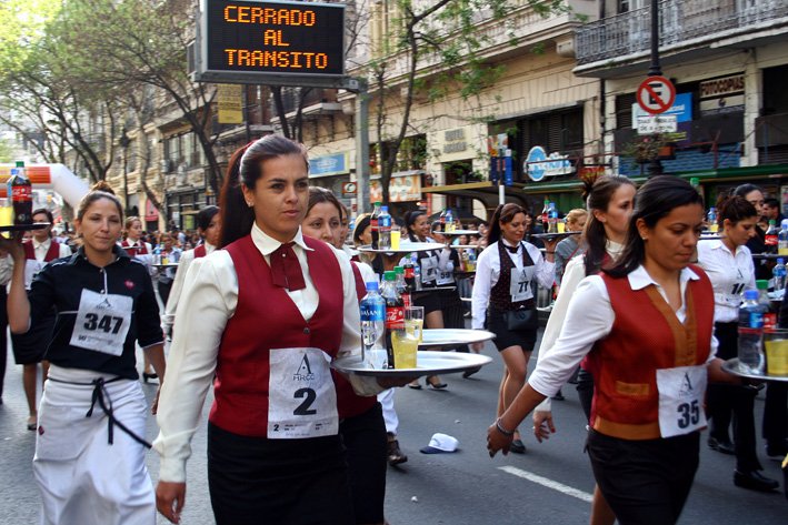 500 mozos y camareras caminando a paso sostenido con sus bandejas en mano. No se trata de una masiva concurrencia de clientes a los cuales hay que atender rápidamente, sino de una ya tradicional carrera donde ellos y su habilidad son los protagonistas.