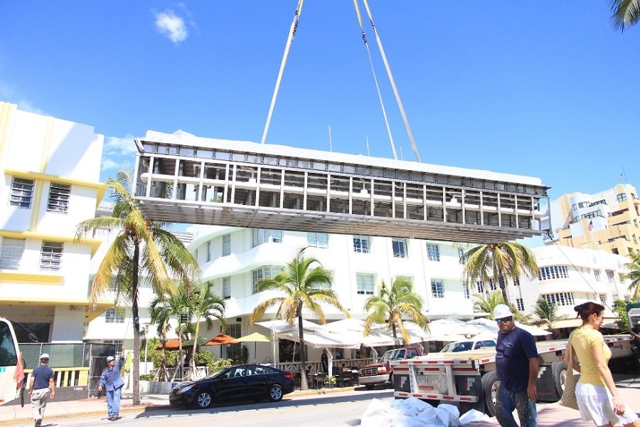La primera vez fue cuando una inmensa grúa y un enjambre de obreros - y curiosos - bloquearon durante todo un día la Ocean Drive para montar sobre la parte alta del edificio una piscina de acero inoxidable (más liviana que una de hormigón). Generar este espacio demandó desarrollar una estructura secundaria que permitiera levantar el techo para darle profundidad al edificio de tal manera que posibilitara construir una terraza sin alterar su fachada, como es ley en el área.