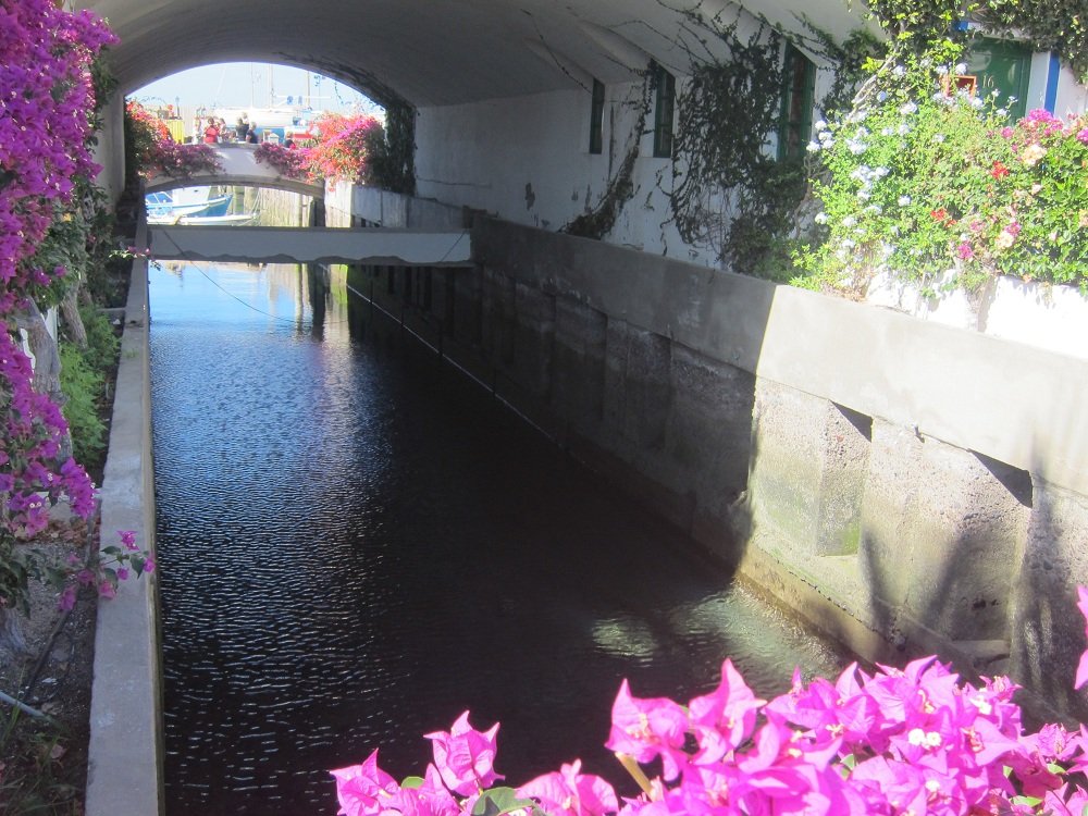 Mogán es un amplio valle que se extiende desde el barranco del mulato hasta el mar, una incomparable vega donde crecen diversos frutos tropicales entre los blancos caseríos rurales. En su puerto se practica pesca de altura y al mismo desembocan las aguas saladas de las montañas y barrancos por unos canales conectados entre sí con avenidas y pequeños puentes adornados con flores -buganvillas de diferentes colores que dan un toque de color al ambiente tranquilo. Por esta razón alguien con ingenio la bautizo como “La Venecia del Atlántico”, seguramente este personaje no conocía la genuina y mítica Venecia. A Mogán le sobra el sobrenombre de la ciudad Italiana y hasta puede resultar excesivo el tratamiento.
