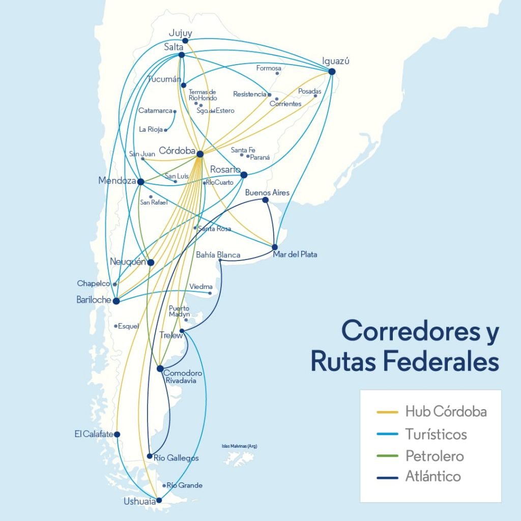 Vale recordar que ya se había recuperado el “Corredor Petrolero” cubriendo las rutas entre Comodoro Rivadavia –Neuquén – Mendoza. A dicho corredor se integra Córdoba –Mendoza con 4 frecuencias semanales.