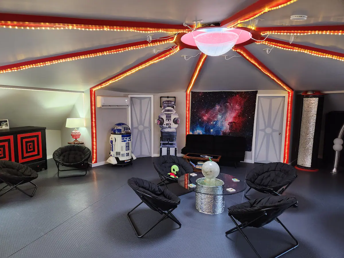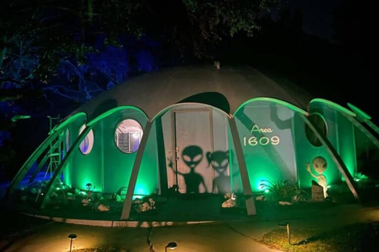 Esta casa cúpula con forma de Objeto Volador No Identificado (O.V.N.I) ha aterrizado desde una galaxia lejana en el pintoresco lago Placid en Florida, Estados Unidos. Es un alojamiento ideal para festejar Halloween, relajarse junto al pozo de fuego y jugar en el loft Galaxy Arcade a Star Wars, Space Invaders y Terminator.