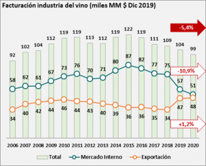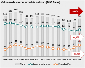 Para los doce meses cerrados en mayo de este año se puede observar un importante crecimiento de los despachos de vino desde las bodegas (+4,7%) y un crecimiento de los volúmenes de exportación, en especial de vino granel de bajo precio (+24,3%), lo que generó un aumento del volumen total, según cifras oficiales del 9,9% en relación al mismo periodo del año anterior. Esta situación ya se había revertido en el 2019 gracias a los fuertes envíos de vinos a granel.