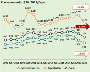 En cuanto a los precios promedio medidos en moneda constante, se advierte una caída muy importante. En el mercado interno, medido después de los sustanciales descuentos que se realizan como promoción, el precio promedio ha disminuido en moneda constante casi un 15% en relación a un año atrás que ya había tenido una importante caída en relación a 2018. En el mercado externo, la disminución total (vino fraccionado más granel) ha sido aún más importante dado que lo que se expandió fue la exportación de vinos a granel de bajo precio. El precio promedio de cada caja equivalente vendida cayó casi un 14% y dejó la cotización en niveles por debajo de 2009.