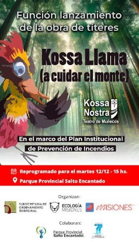 El martes 12 de diciembre, a las 15, se realizará la función de títeres “Kossa Llama (a cuidar el monte)”, a cargo del grupo de teatro de muñecos “Kossa Nostra”, en el Parque Provincial Salto Encantado.