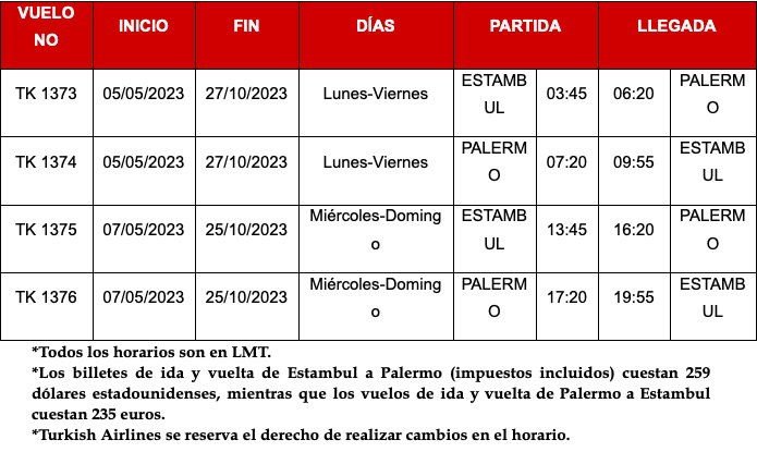 Los vuelos previstos a Palermo serán operados con aviones tipo Boeing 737-800 desde el aeropuerto de Estambul hasta el aeropuerto de Punta Raisi. Turkish Airlines ofrece a los pasajeros la oportunidad de viajar a precios de lanzamiento especial a partir de 259 dólares estadounidenses, incluidos todos los impuestos para vuelos de ida y vuelta.