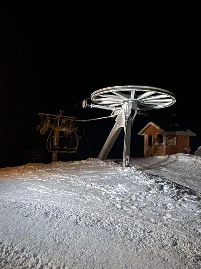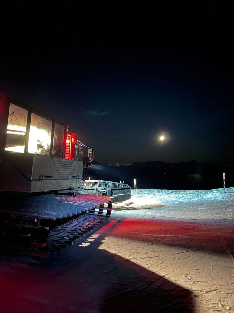 Una vez en marcha, remontamos por las pistas Camino del Bosque y Avutarda. Subiendo desde la cota 420 hasta la 600, donde cruzamos el límite de vegetación. Desde allí nos dirigiremos por La Brecha hasta la cumbre con el impresionante marco de la piedra dividida. El lugar perfecto para las fotos en la noche del fin del mundo, con el pisa nieve de fondo y el valle a nuestros pies. Aquí los pasajeros no esquiadores descienden en el pisa nieve y los esquiadores expertos pueden ponerse